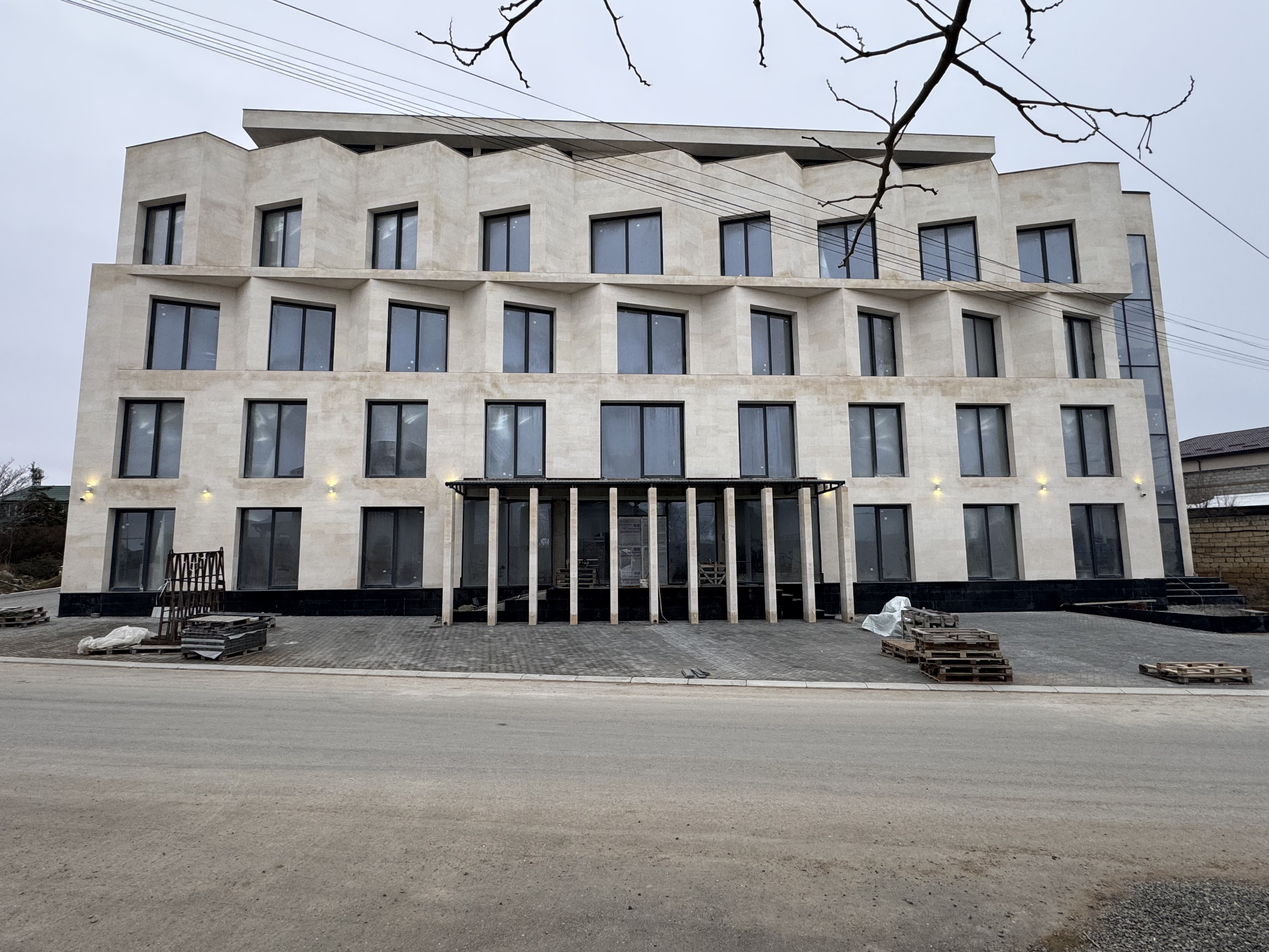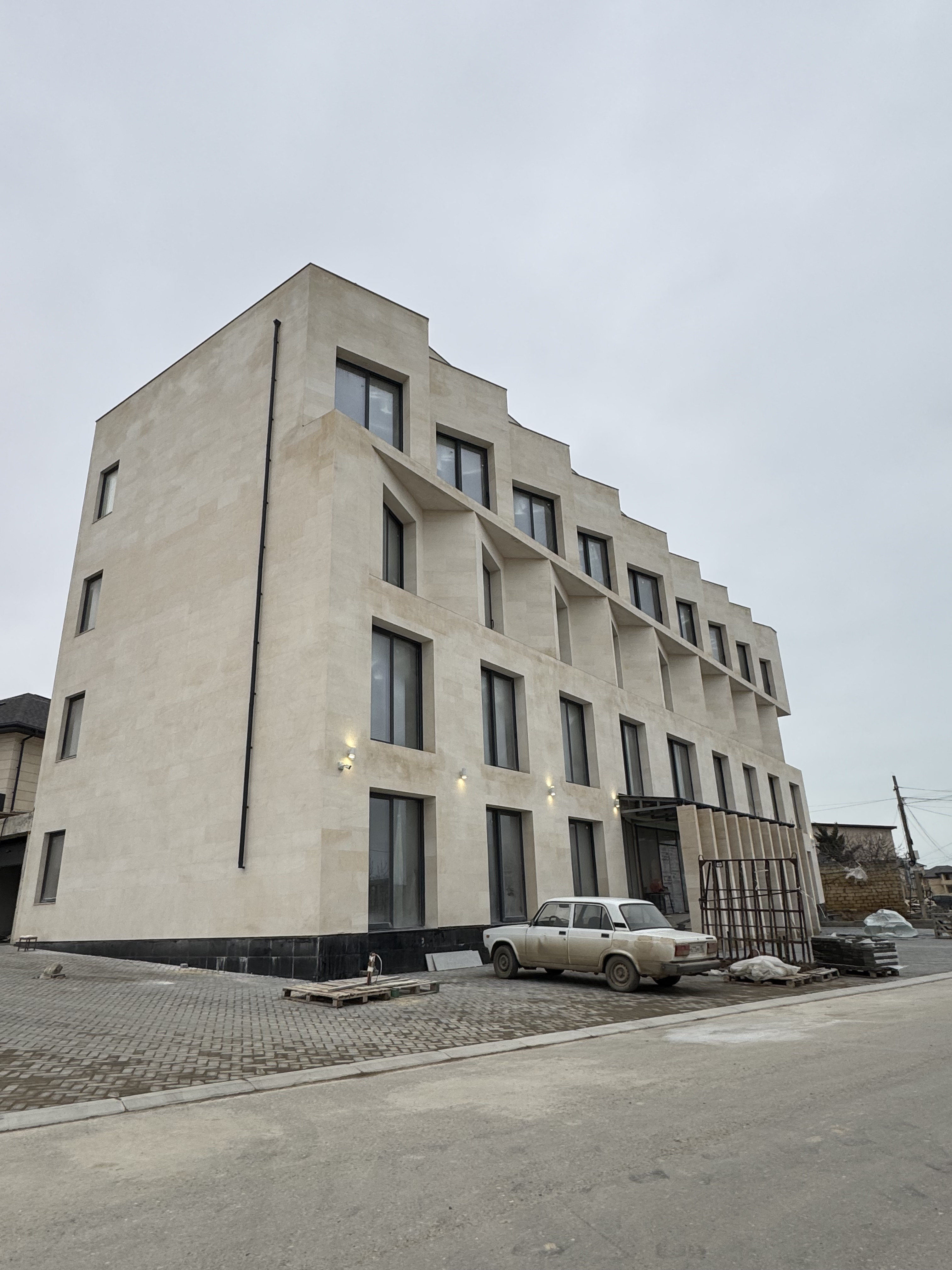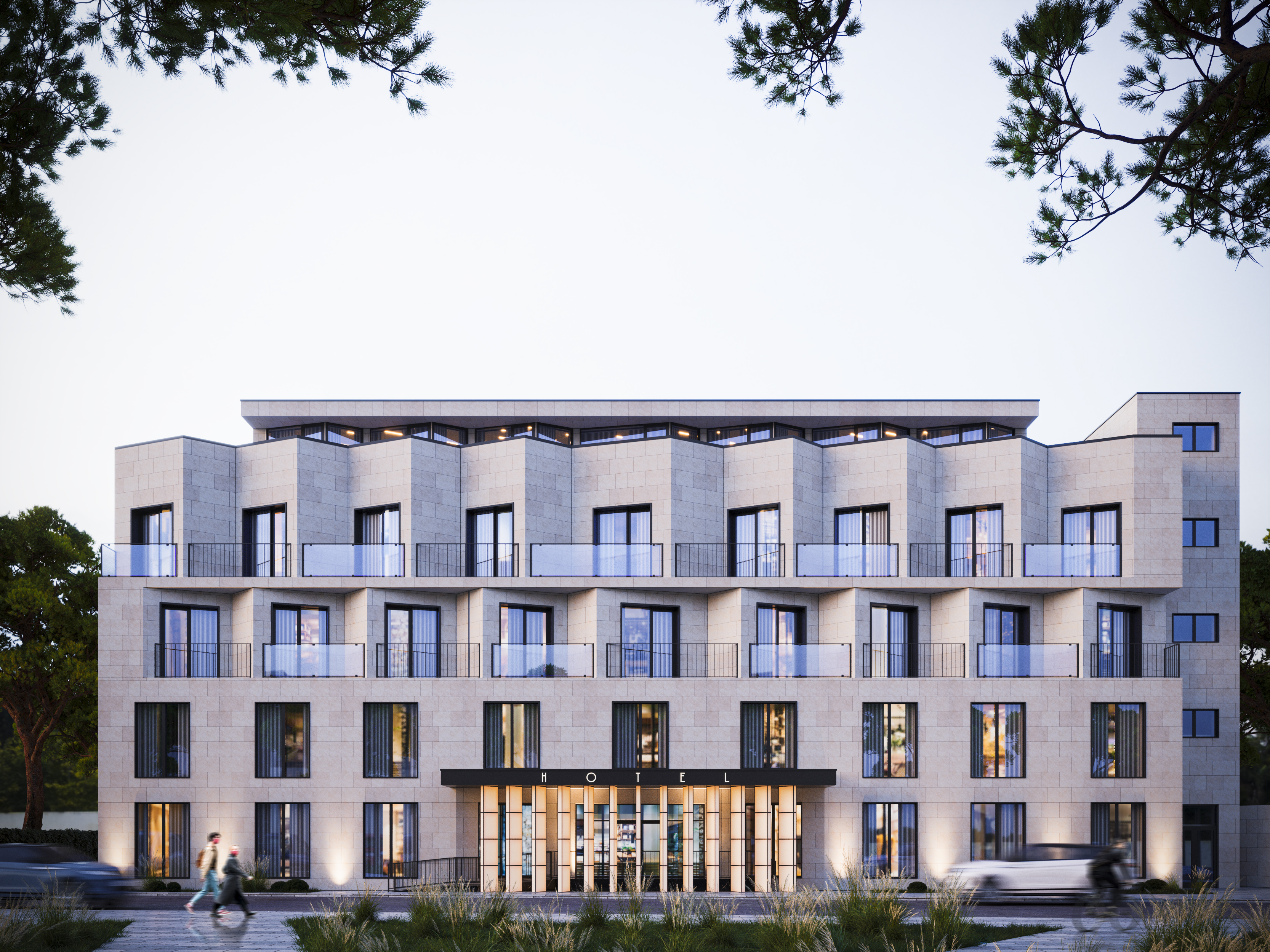 5 этажное здание гостиницы спроектировано так, чтобы 5 этаж не был активен с точки зрения объема, поэтому он углублен и имеет меньшую площадь относительно всех этажей.