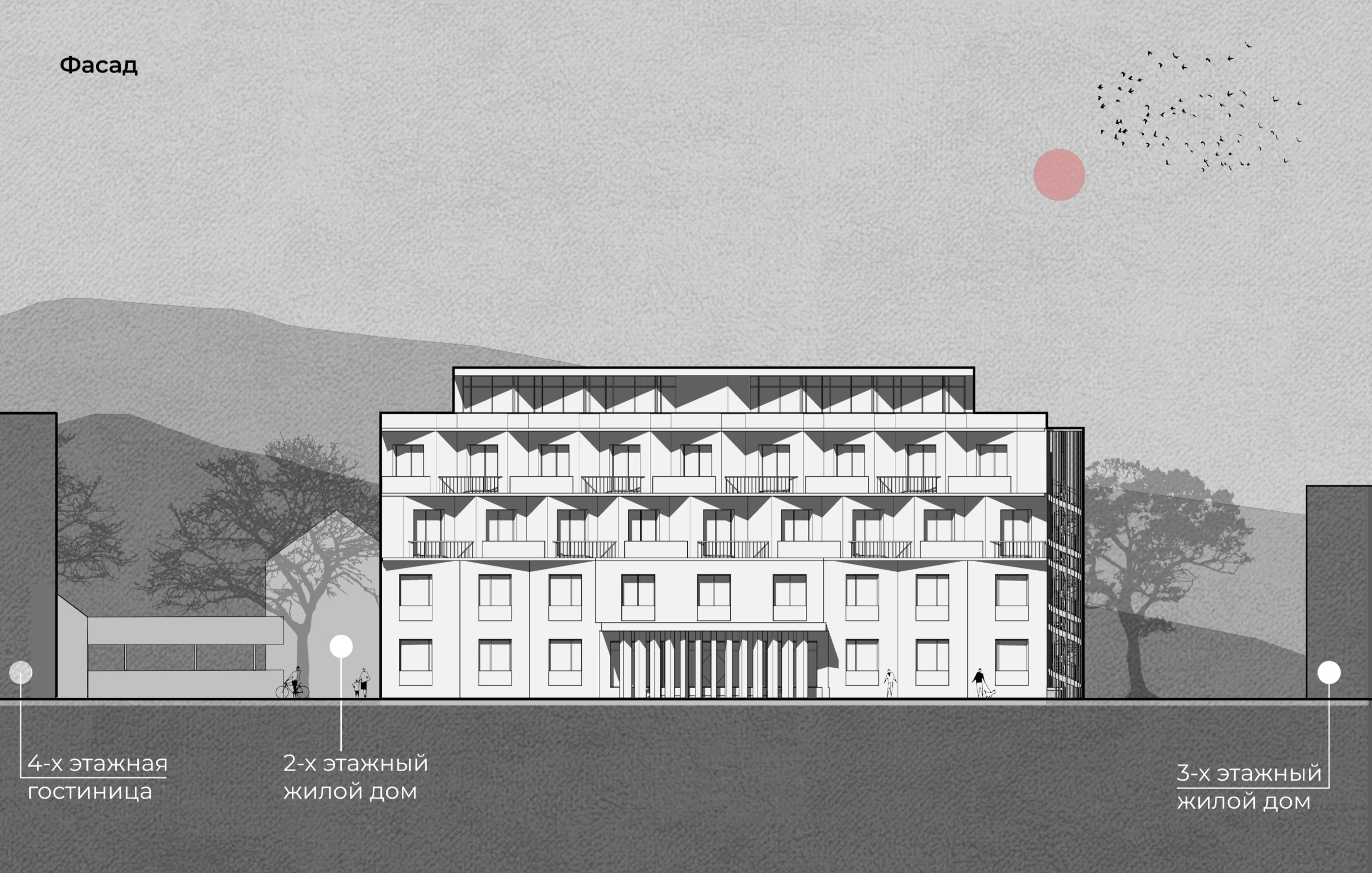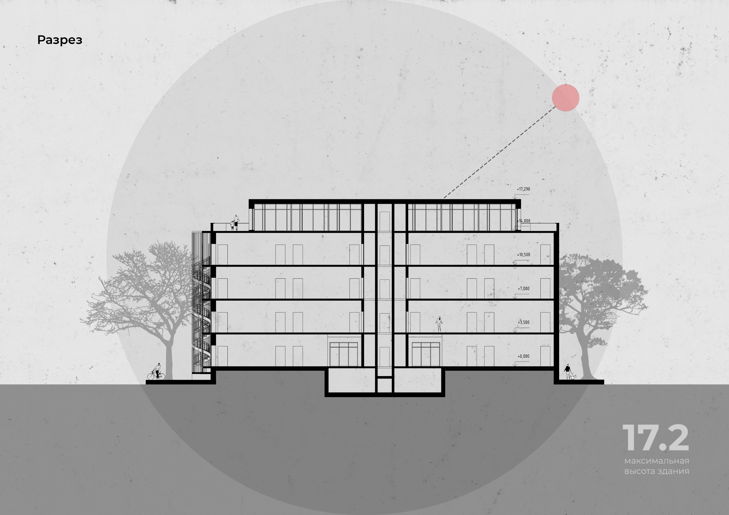 Разрез для отображения вертикальной структуры. Фасад для сравнения высотности проектируемого объекта, с окружающими его строениями. Этого можно было добиться более легкими способами, но мы не ищем легких путей, нам нужны лучшие, креативные решения. Это окупается!